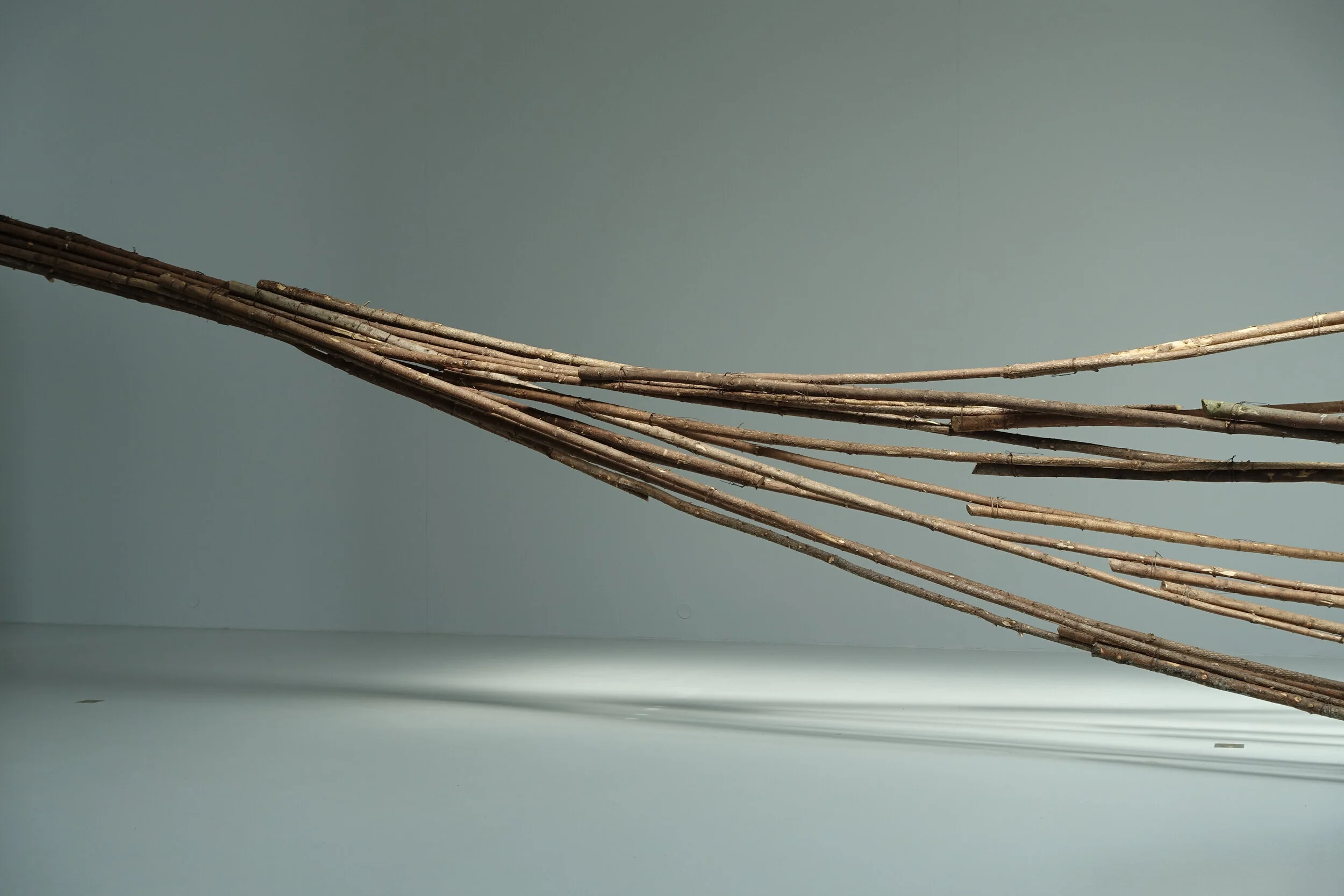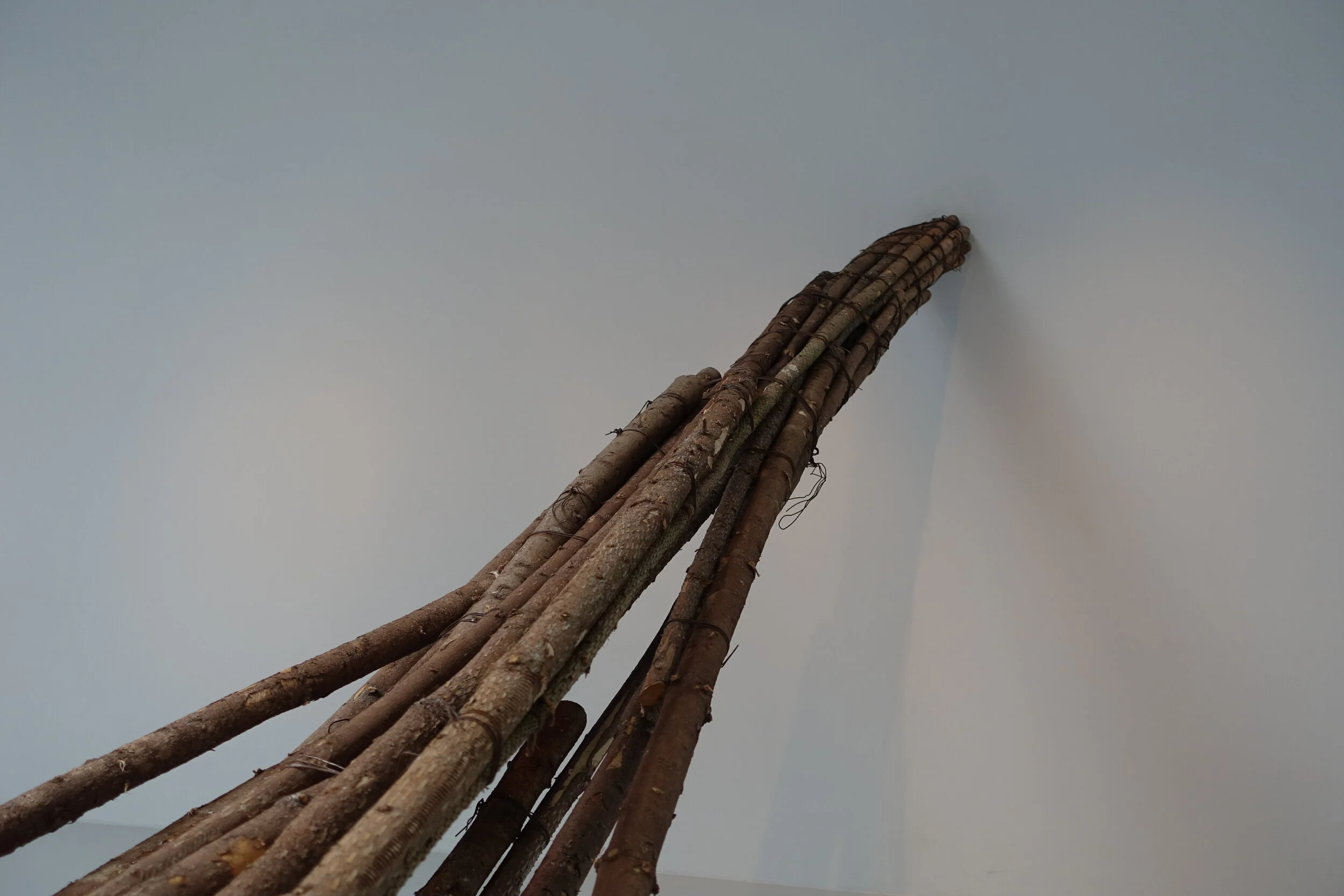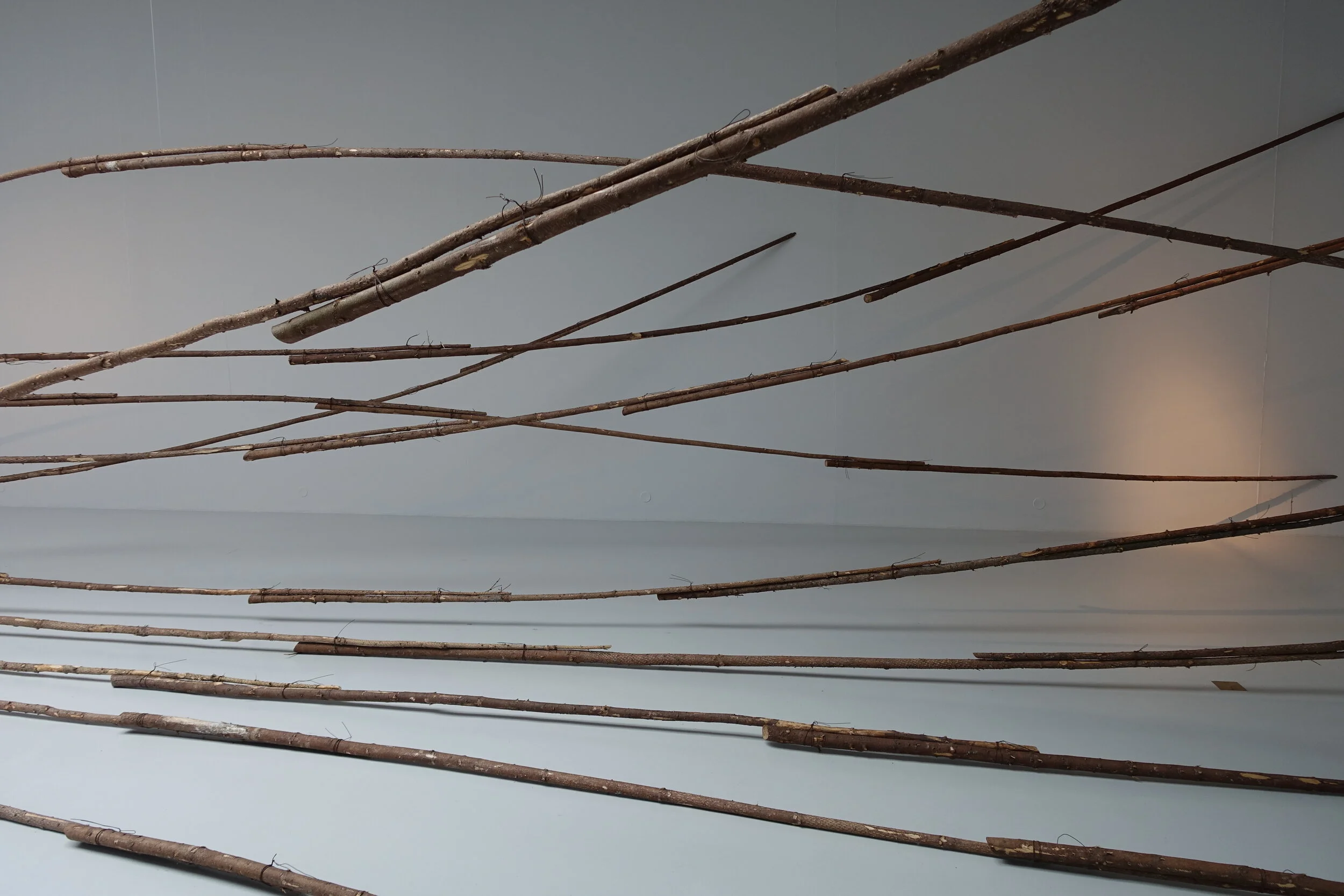 I konsthallen har jag gjort samma sak fast tvärtom, en sorts dubbel spegling Vi säger att vi bor i skogen i Småland, men vad är skog? Skogen som den en gång var innan vi kom hit, finns inte längre. Skogen är intagen, tyglad, uppbunden, hopbuntad, kuvad och drömmer sig ut genom instuitionens väggar.