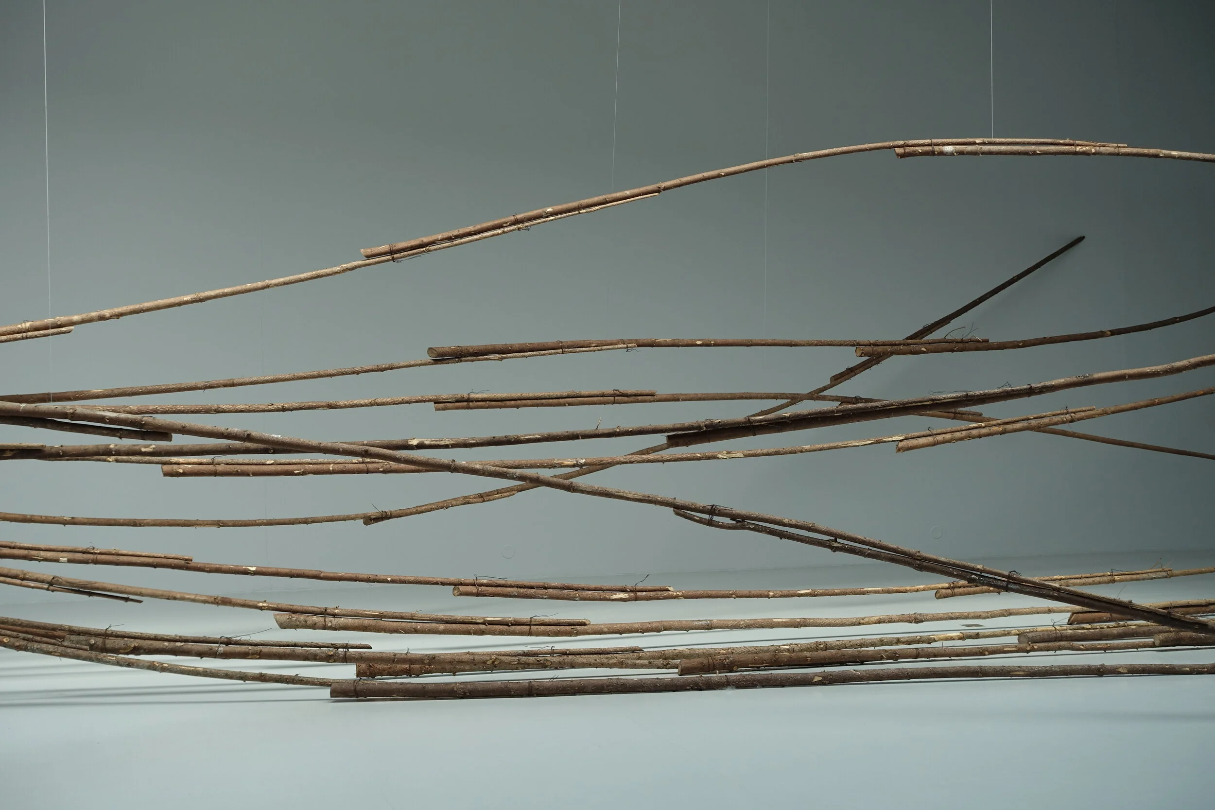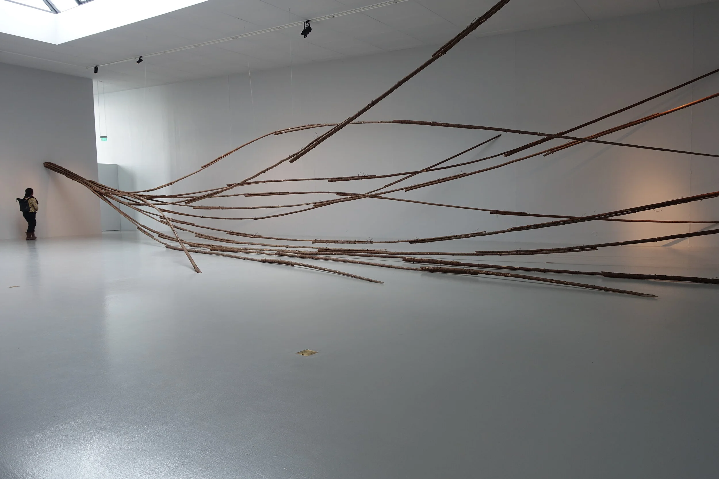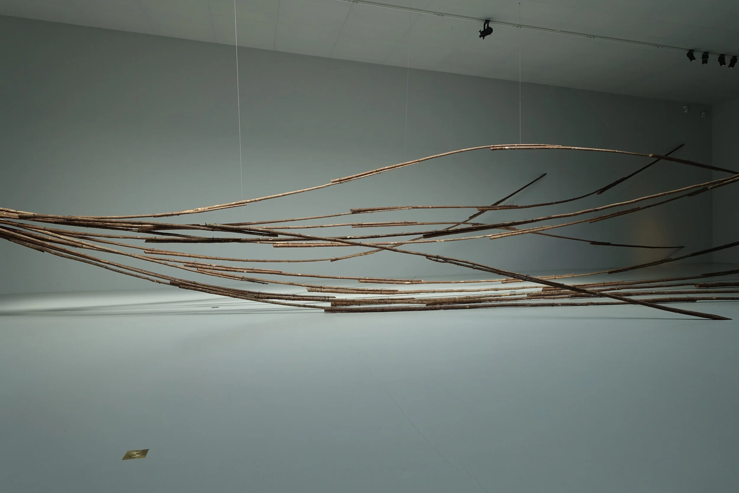 I konsthallen har jag gjort samma sak fast tvärtom, en sorts dubbel spegling Vi säger att vi bor i skogen i Småland, men vad är skog? Skogen som den en gång var innan vi kom hit, finns inte längre. Skogen är intagen, tyglad, uppbunden, hopbuntad, kuvad och drömmer sig ut genom instuitionens väggar.